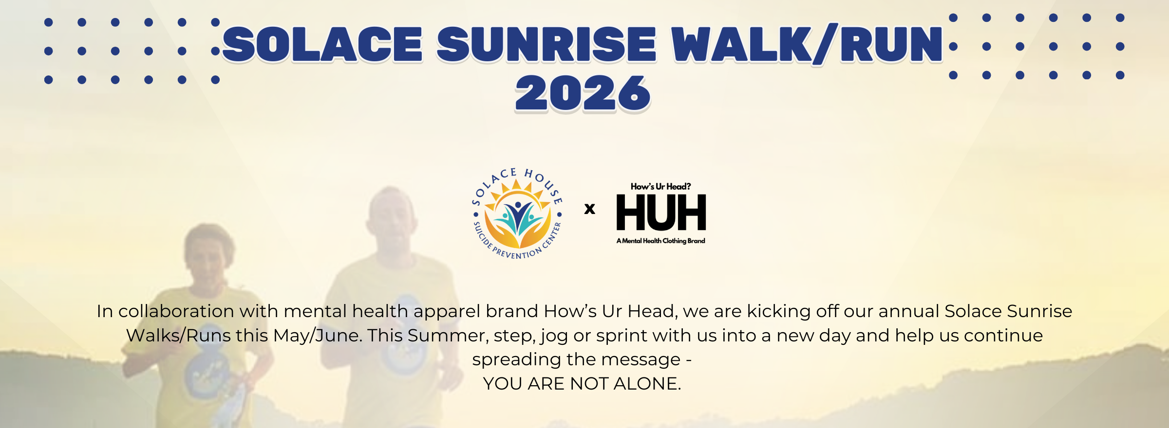The Solace Sunrise Walk is an annual 5k walk/run that raises funds and awareness for suicide and self-harm prevention. Those participating walk from the darkness of pre-dawn into the bright, sun-filled morning, symbolizing the journey many in suicidal distress undertake when attending our services.